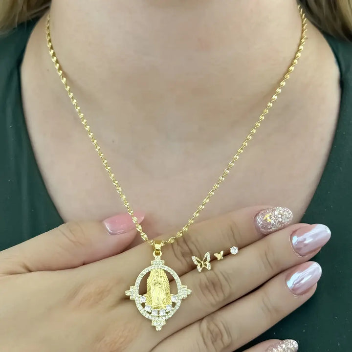 Conjunto De Dama Con Cadena De Tejido Chino, Dije De La Virgen Y Set De 3 Pares De Topos + Envío Gratis